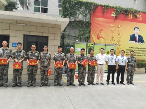 值此8月1日,中國人民解放軍建軍89周年之時,集團總裁趙術開、總裁辦主任范叢明、物業管理公司副總經理何先兵對公司一線保安們進行了“八一”建軍節走訪慰問送