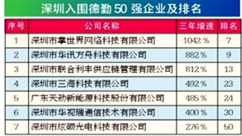 頒獎典禮在深圳舉行。深圳地區(qū)有7家企業(yè)上榜,華訊方舟位列第9,其三年增長率高達(dá)882%。
